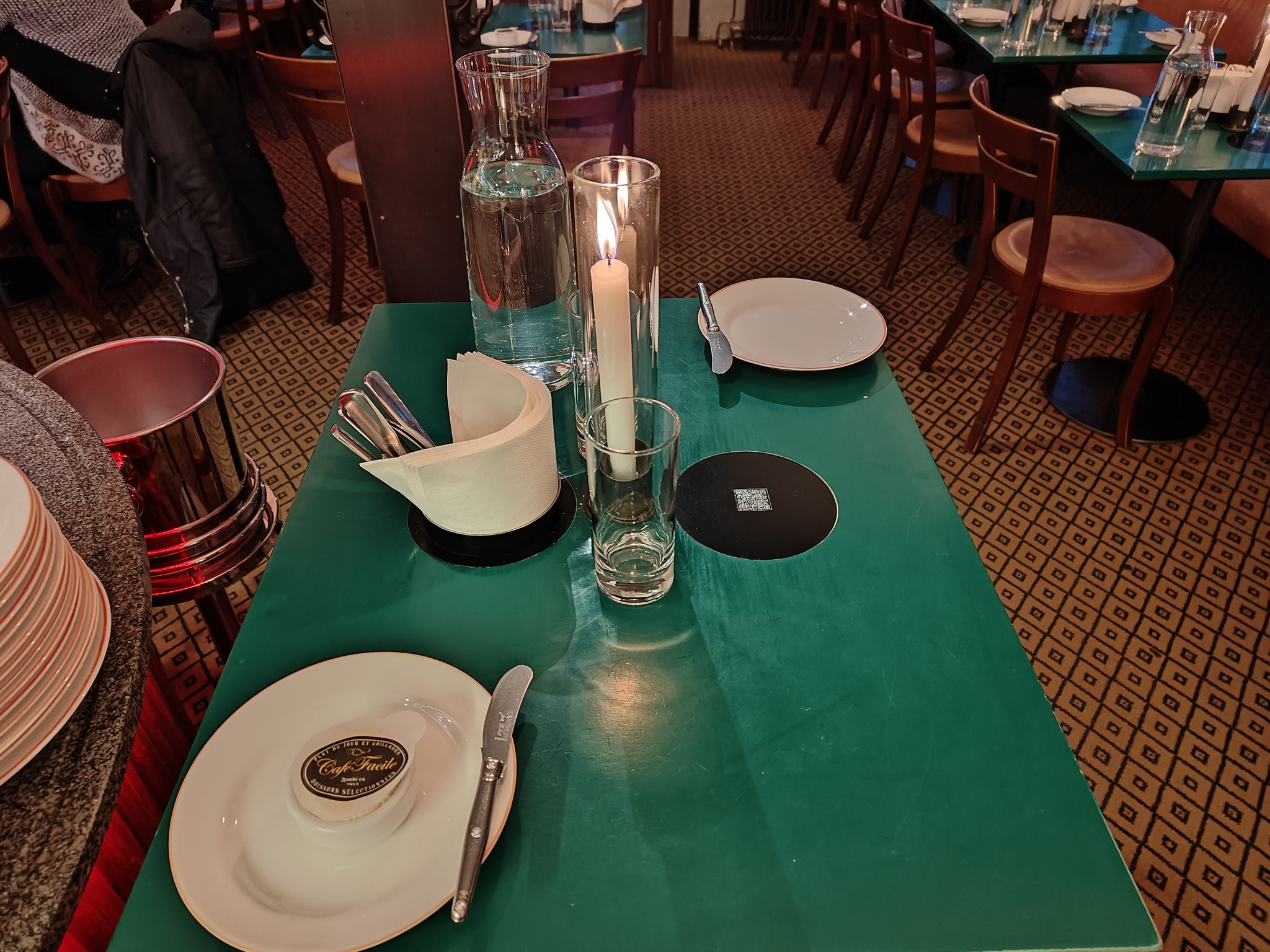 The menu is on a blackboard in the restaurant and at CafeFacile.se (QR-code on the tables). The black cylinders contains napkins and cutlery. The salt and pepper mills can be difficult to tell apart ... We have white pepper in our pepper mills.
