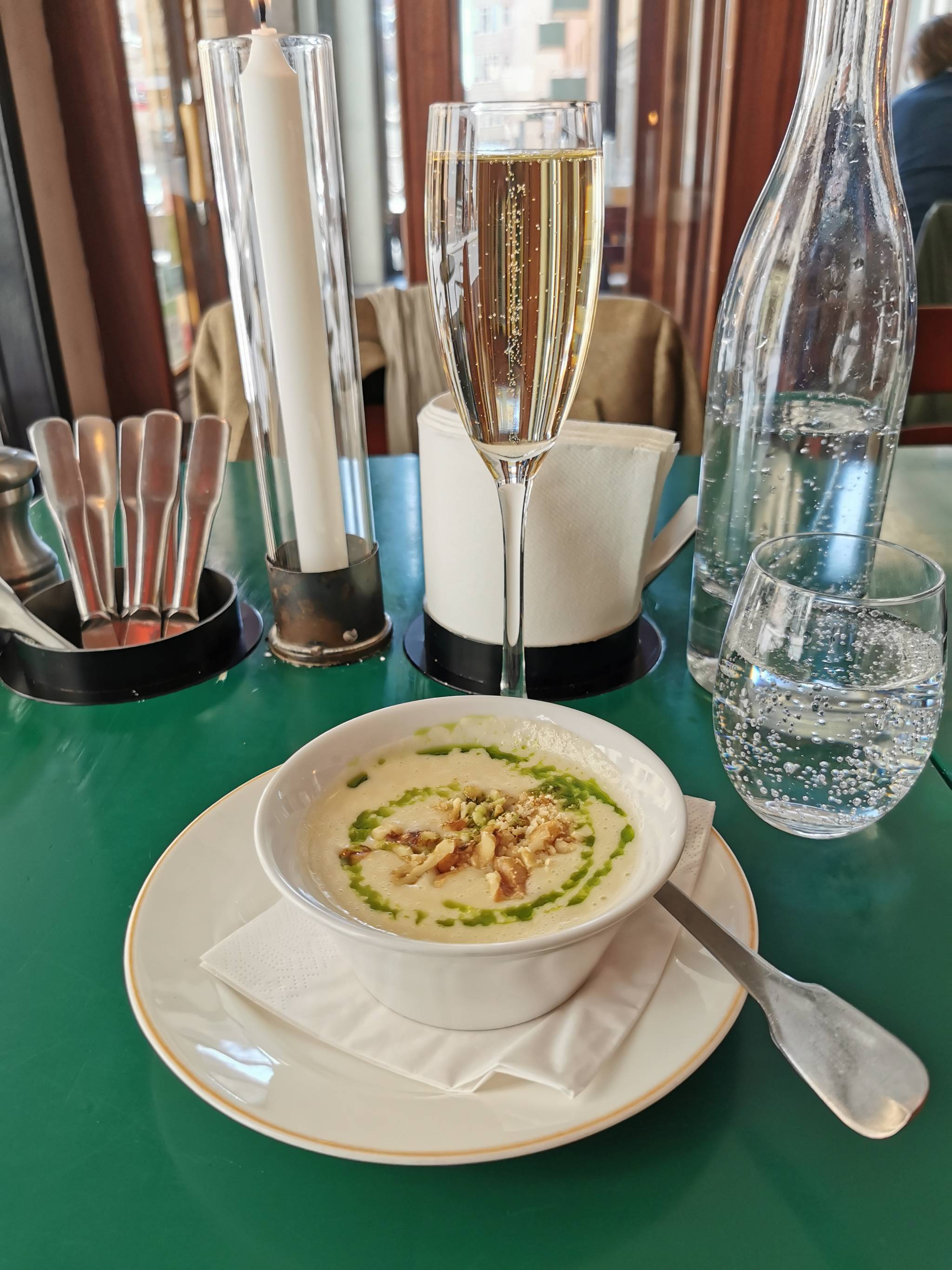 Entree Jerusalem artichoke soup with walnuts and thyme oil.