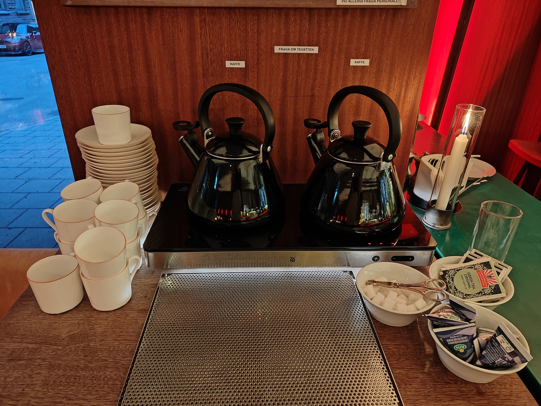 Filtered coffee and tea are included, if you are a dinner guest. We grind our special blend "Kaffe Facile" from the Ostindia roastery seconds before we brew, which gives a strong and aromatic coffee. You can buy espresso, but we do not have a milk frother.