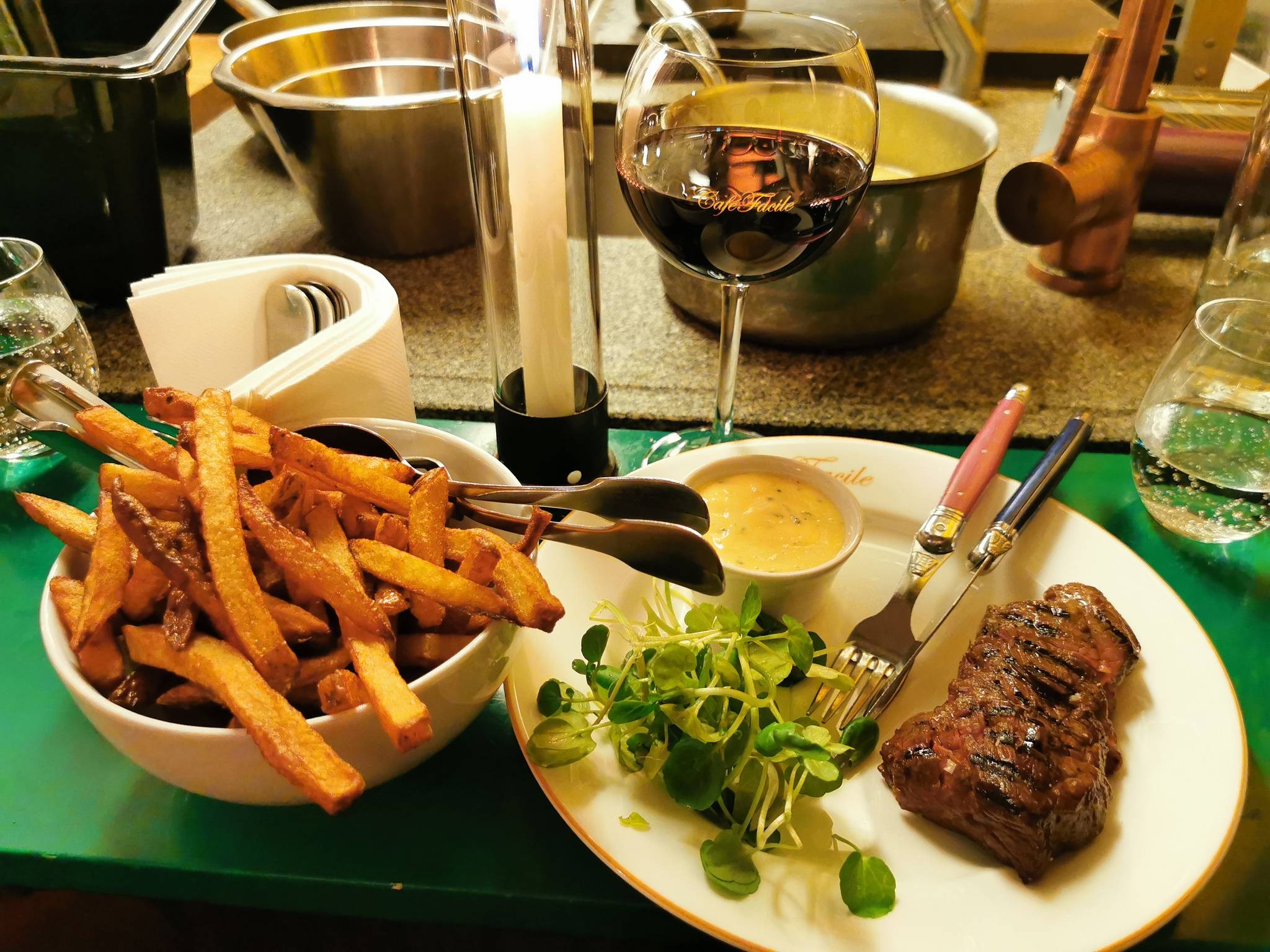 Steak frites on butchers steak with béarnaise sauce and watercress.